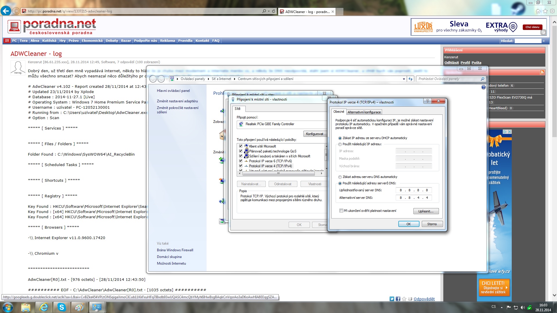 ''Dole v okně pod chybami máš popsanou příčinu těch chyb. Podle toho se zařiď.'' - Jop, kdybych tomu tak rozuměl.... DNS jsem si nastavoval jak mi tu radili (google DNS) takže mně nejde do hlavy, když mám nastaveno DNS na google, proč mně pořád hlásí že nějaký jiný DNS servery neodpovídají.