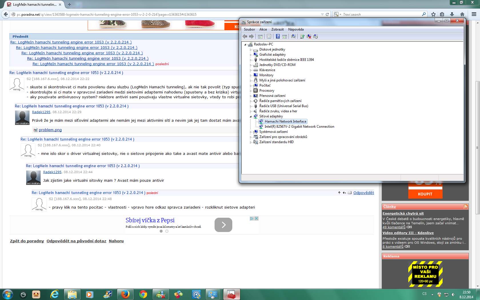- skontrolujte si ci mate v spravcovi zariadeni medzi sietovimi adaptermi nahodenu (spusteny a bez krizika) virtualnu sietovku s podobnym nazvom (LogMeIn Hamachi tunneling)