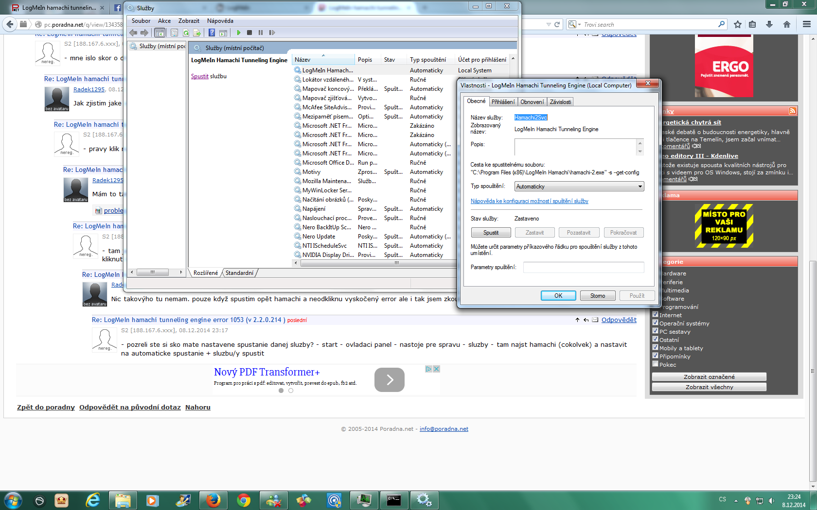mám problem se spustěním LogMeIn Hamachi. Při spustění přez služby mi vyzkočí toto "Systém windows nemohl b počítači Local Computer spustit službu LogMeIn Hamachi tunneling Engine. Chyba 1053: Služba neodpověděla na řídíví nebo zahajovací požadavek dostatečně včas." Zkoušel jsem vše po zakazaní a znovu povolení síťovky,povolení v antivirovém programu, udělení vyjímky ve Firewallu po přidaní "EngineConfigDir" do registru s hamachi... Několikrát jsem jej zkoušel i přeinstalovat.. Opravdu už nevim zkoušel jsem i čistění registru i přeinstalovat windows stejnak tento problem trvá.. Prosím o pomoc. Děkuji :)