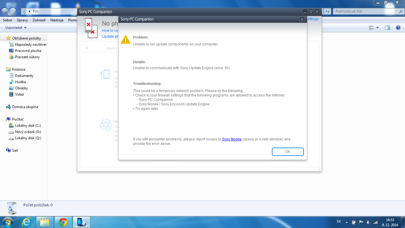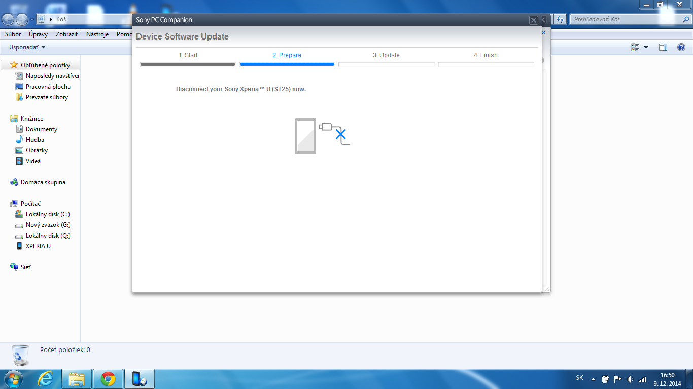 mám telefón Sony Xperia U s androidom 2.3.7 a rozhodol som sa ho updatovať na ice crem sandwich 4.0. Tak som si nainštaloval do notebooku Sony PC Companion 2.1 a hneď mi naskočila možnosť updatovania. Tak to začnem updatovanie a v druhom kroku mi to prestane pracovať. Vypíše mi "Disconnect your Sony Xperia U (ST25) now pozri obrázok "Xperia U". Čakal som asi 15 minút a kedže sa nič nedialo vypol som mobil. Začalo sa sťahovanie a v istom momente mi vyhodilo túto tabuľku pozri obrázok "problem". Skúšal som už aj odpojiť usb kábel no nič nezabralo a neviem v čom môže byť problém.
