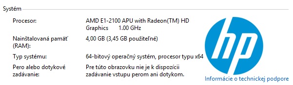 Procesor AMD E1 - 2100 APU with Radeon (TM) HD graphics 1 GHz RAM 4,00 GB (3,45 GB použiteľné) 64 bi…