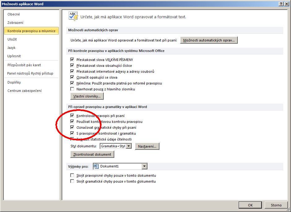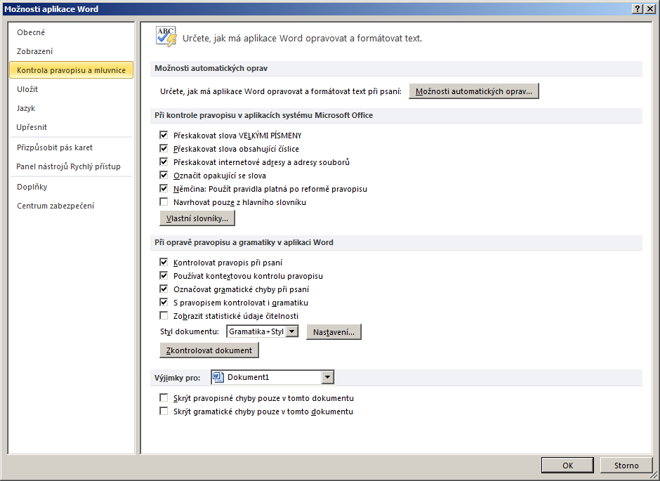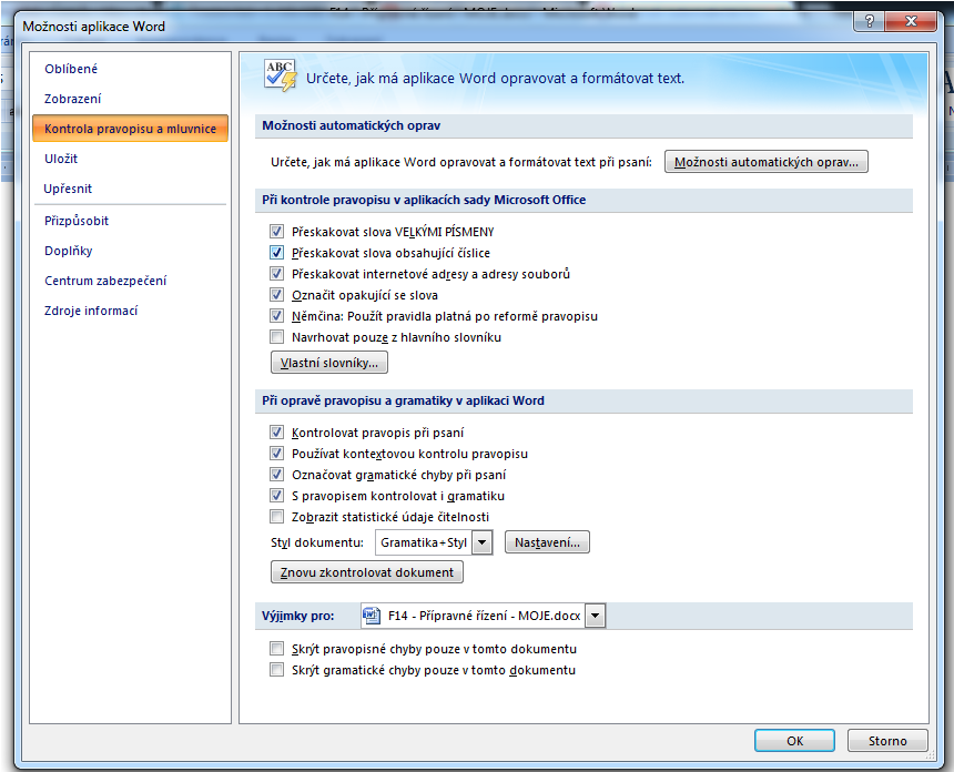 Dobrý večer, prosím vás měl bych jeden dotaz. Nedávno jsem si vypínal automatickou kontrolu gramatických chyb ve Wordu 2007. Tzn. Word mi přestal podtrhávat gramaticky chybná slova. Občas jsem ještě mezi tím přepnul místo Češtiny na Angličtinu ve spodním řádku Wordu. No jo, jenomže teď bych chtěl zase automatickou kontrolu pravopisu (červené podtržení) zapnout. A nevím jak na to :/ Neporadil byste mi prosím někdo? Co jsem na internetu našel, jsem zkusil, ale nic :/ Děkuji za rady