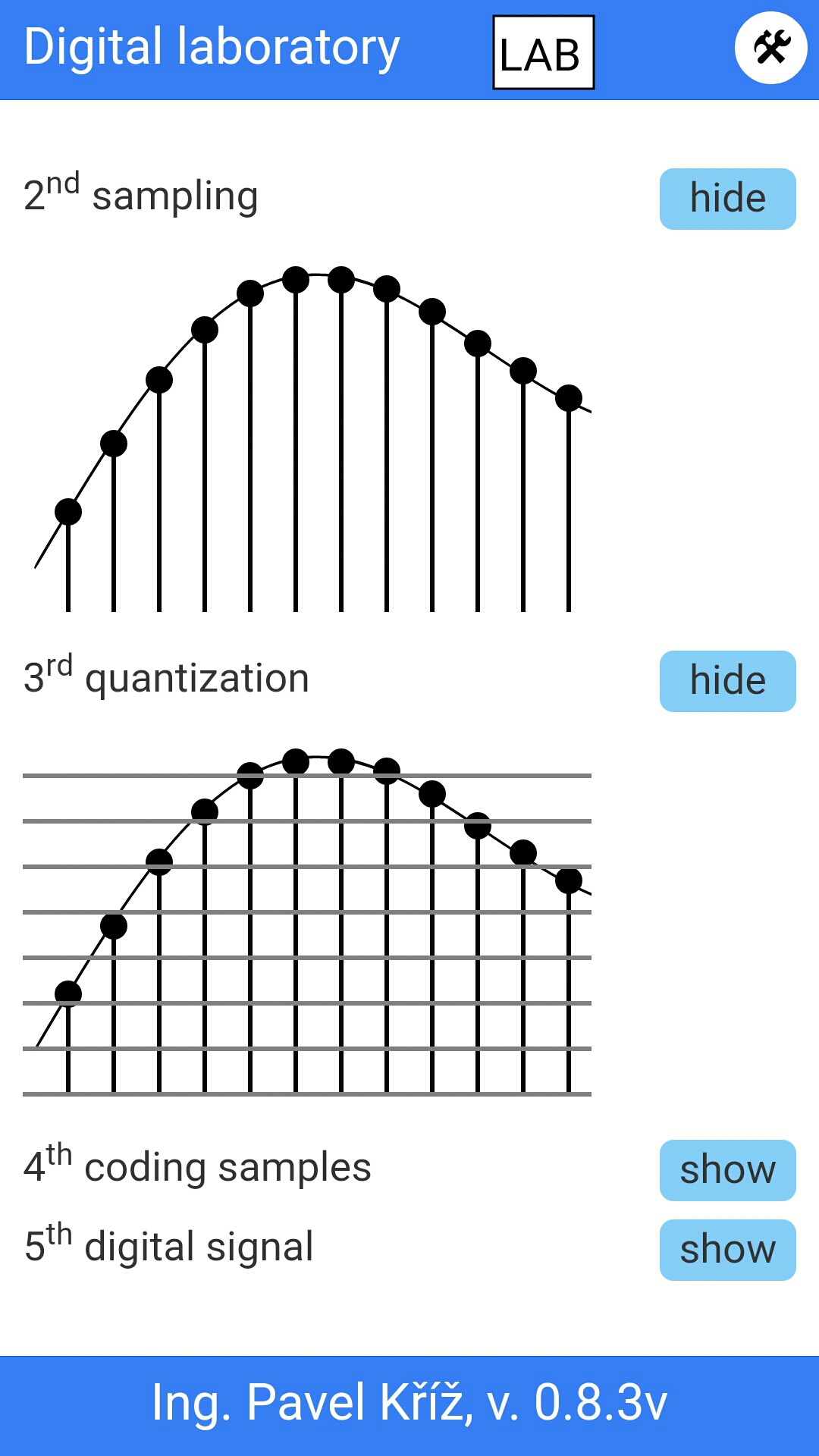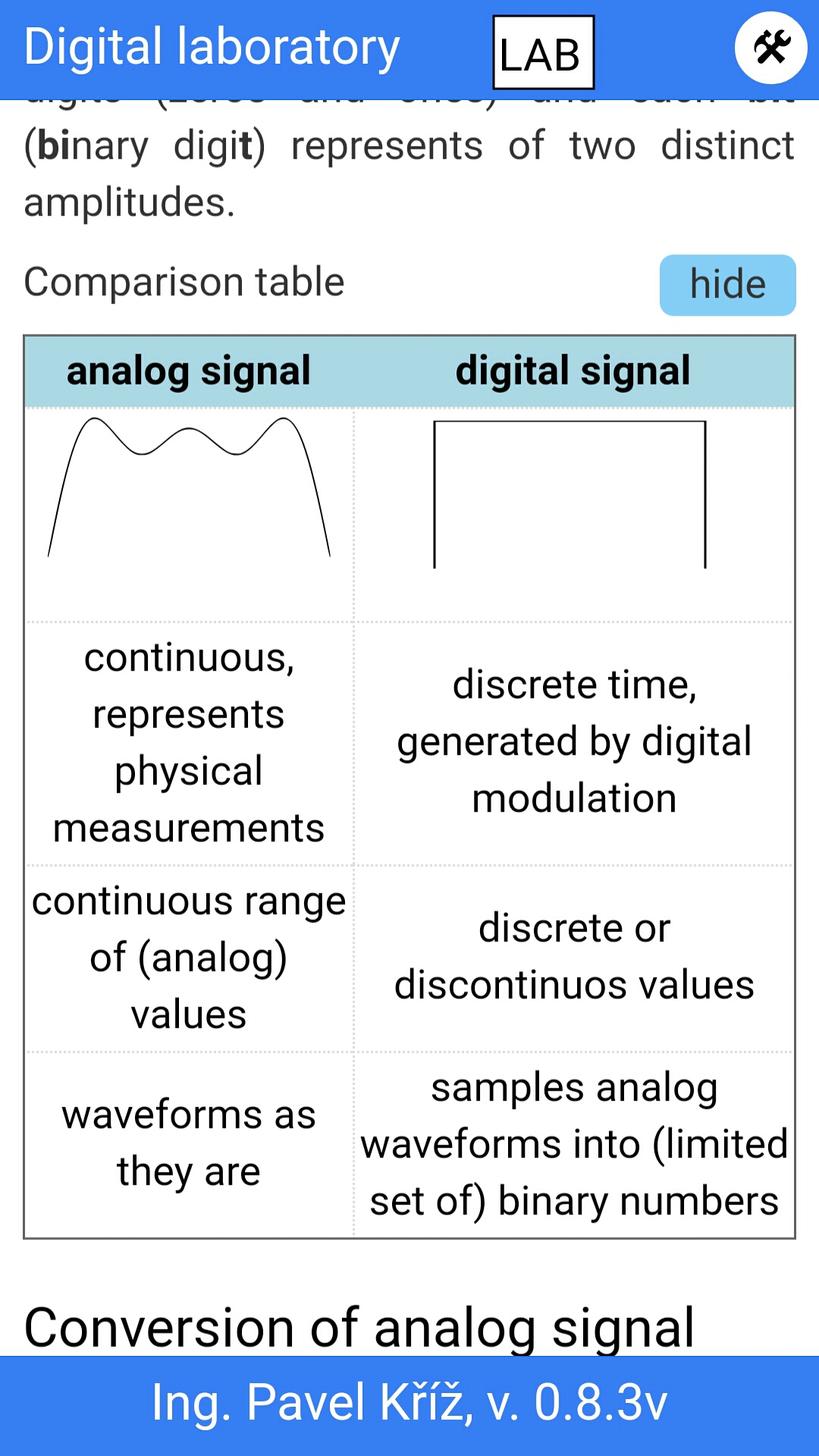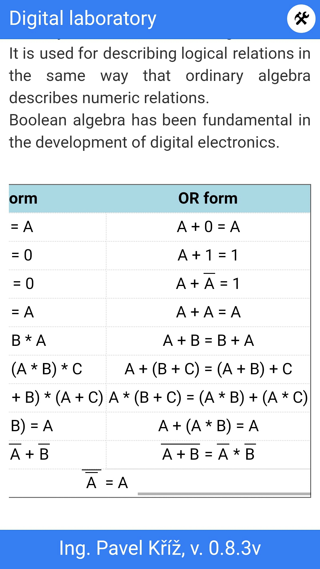 Zaměření aplikace je na digitální techniku, prozatím je tam jen část z logických obvodů, naprosté základy. V aktuální beta verzi je jen třetina ze zamýšleného obsahu.