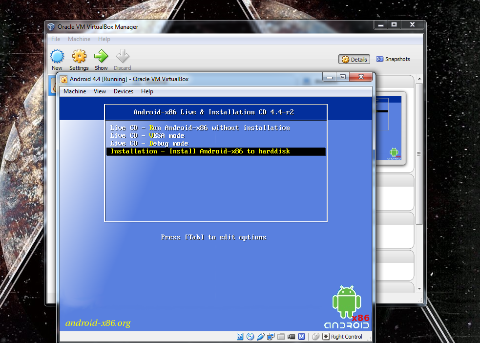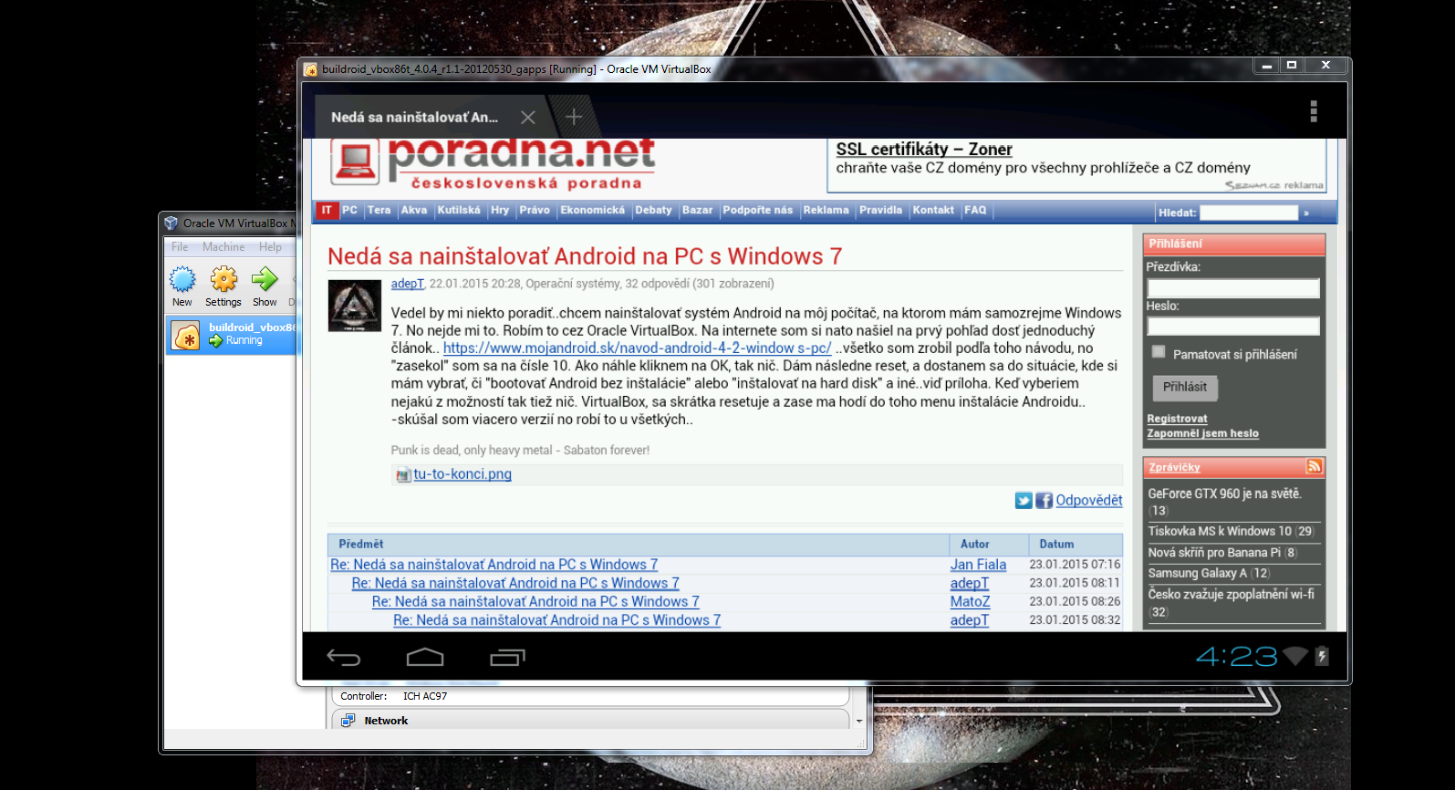 Vedel by mi niekto poradiť..chcem nainštalovať systém Android na môj počítač, na ktorom mám samozrejme Windows 7. No nejde mi to. Robím to cez Oracle VirtualBox. Na internete som si nato našiel na prvý pohľad dosť jednoduchý článok.. https://www.mojandroid.sk/navod-android-4-2-window s-pc/ ..všetko som zrobil podľa toho návodu, no "zasekol" som sa na čísle 10. Ako náhle kliknem na OK, tak nič. Dám následne reset, a dostanem sa do situácie, kde si mám vybrať, či "bootovať Android bez inštalácie" alebo "inštalovať na hard disk" a iné..viď príloha. Keď vyberiem nejakú z možností tak tiež nič. VirtualBox, sa skrátka resetuje a zase ma hodí do toho menu inštalácie Androidu..