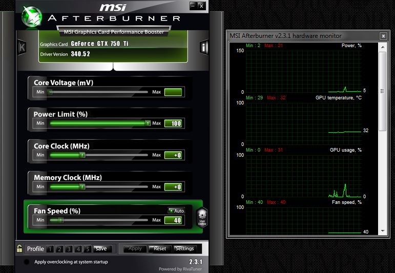 Zdravím,chtěl jsem si přetaktovat grafiku (NVIDIA GeForce GTX 750Ti) pomocí MSI Afterburner (Instalční CD byl v krabičce s grafickou kartou) ale moc se v tom programu nevyznám. Zatím to mám takto. (Myslím že je to defaultní nastavení).