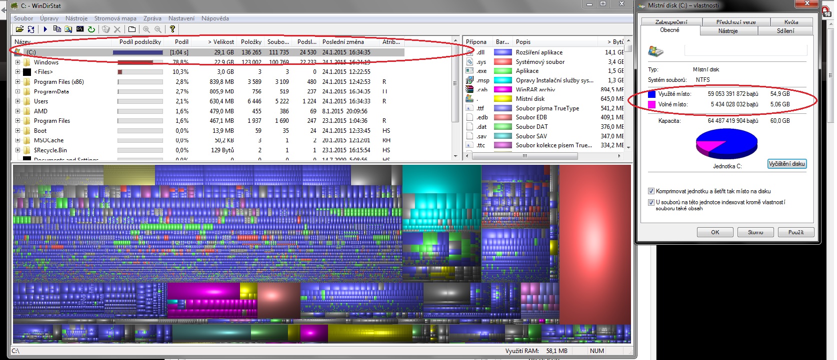 od formátu a čisté instalace Win 7 SP1 jsem narazil na problém. Vyhradil jsem si oddíl čistě pro systém o velikosti 60gb. Po asi týdnu používání jsem s překvapením zjistil, že na tomto oddílu mám volné místo pouze asi 3GB. Projel jsem tedy vše, co šlo, vyčistil, co se dalo a nedostal jsem přes výsledek 5 a něco GB volného místa. Přišlo mi to divný, tak jsem projel složku po složce, kolik zabírá kapacity a nedostal jsem se na číslo větší než 30GB. Pro jistotu jsem si stáhnul utilitu WinDirStat, abych to měl potvrzený - viz přiložený screen. Podle ní má C: mít volnýho místa 31 GB. Ale windows to né a né určit stejně. Nevíte někdo, v čem může být problém? Mám nainstalováno asi 5 programů, všechno na jiném oddílu a nic závadnýho jsem nestahoval, antivir nic neodhalil, registry jsem vyčistil a všemožný mezipaměti atd. taky. Už mě nic nenapadá.