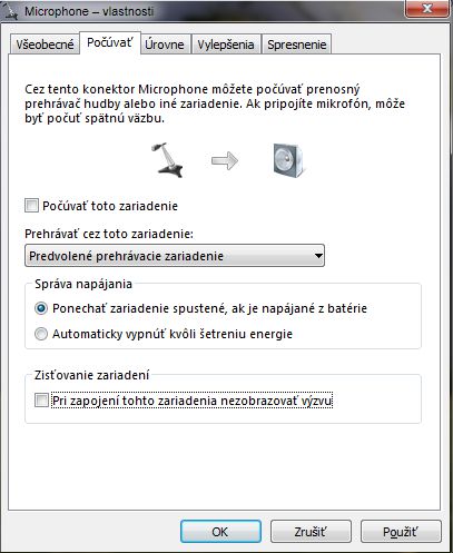 - pravy klik na ikonu repraku, dole pri hodinach - nahravacie zariadenia - zvolit mikrofon, dat vlastnosti - karta pocuvat a nastavit podla obr. prilohy