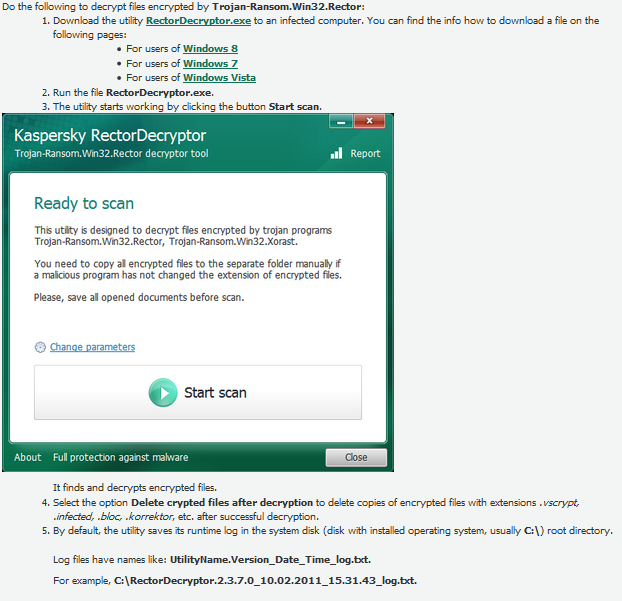 Dik za tip, ale toto nie je Rector virus, ale CTB locker a liek na to nema ani Kaspersky. Pri clanku z 29.1.2015 je odporucanie zalohovat svoje subory (vcera;o)), map zapnutu ich online ochranu a ked uz ste nakazeny a chcete svoje subory tak musite zaplatit. Bohuzial vsetky velke antivirove firmy tvrdia nieco podobne.