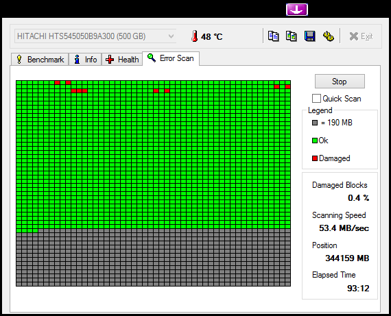Teď jsem našel HDTune a při testech "error scan", kde běží "kostičky" mám zelené ale i červené. Znač…