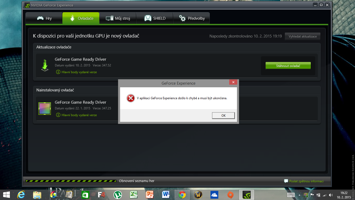 Ahoj mám takový problém s programem Nvidia Geforce Experience, fungoval mi dodnes když mi zahlásil aktualizaci, chtěl jsem aktualizovat ale program mi napsal že neodpovídá a ukončil se. Takto jsem postupoval několikrát až jsem se rozhodl ho přeinstalovat, opět neodpovídá :// . Nevíte prosím čím by to mohlo být??
