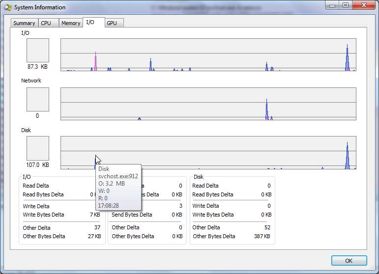 Mám tu sledování prostředků, kde mi píše co disk používá i v jaké velikosti. Sleduje to i celkovou aktivitu disku.