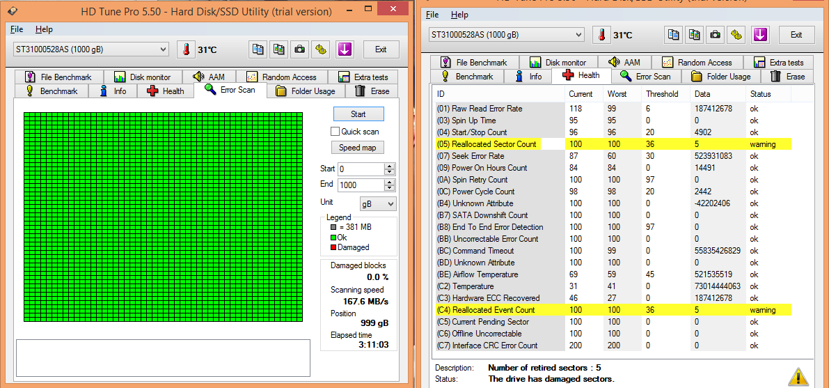 Zdravím, v poslední době mám problémy s harddiskem, celkem často se mi stává že se mi začne z ničeho nic freezovat komp a to mám zaplý třeba jen chrome... když otevřu správce úloh tak mi hdd běží na 99%. MŮJ HDD: ST31000528AS ... Stáhnul jsem HD tune a udělal jsem error scan, ale žádný error nenašel, jen v záložce health mi ukazuje dva warningy (viz. screen).