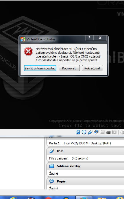 klikni na pokracovat. Ked nechces aby to vyskakovalo tak si zrus VT-x v nastaveniach toho virtualneho pocitaca vo virtualboxe