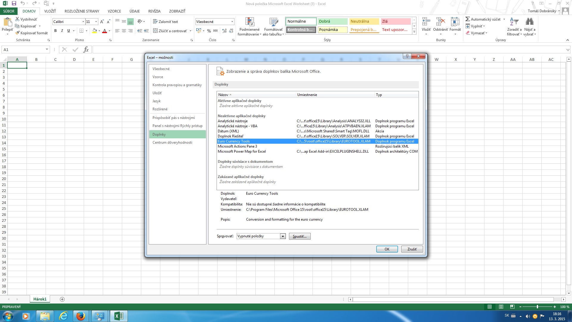 Takže som zadal Excel/Subor/Možnosti a zistil som že všetky doplnky sú neaktívne. V núdzovom režime šiel ok ale keď dám normálne skrýva tabuľku.