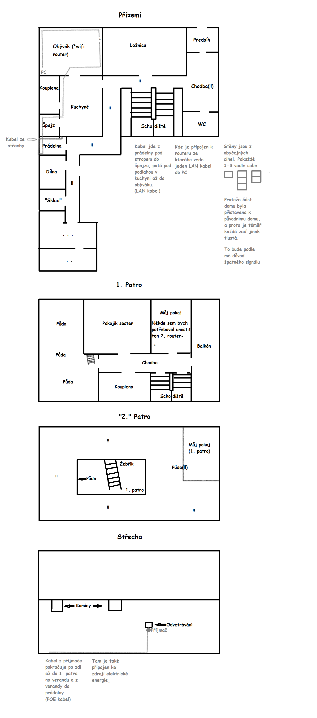 Tak ted se mi z toho trochu zamotala hlava. Ale já vám to zkusím nějak shrnout. U sester je na notebooku signál 4-5/5, ale u mě už jen 1-2/5, což je opravdu špatné. Poté si myslím, že teoreticky by se dal opravdu nějak kabel protáhnout z obýváku zdí do ložnice a potom stropem v pravém zadním rohu ložnice, ale nejsem si úplně jistý, kde by kabel "vylezl".