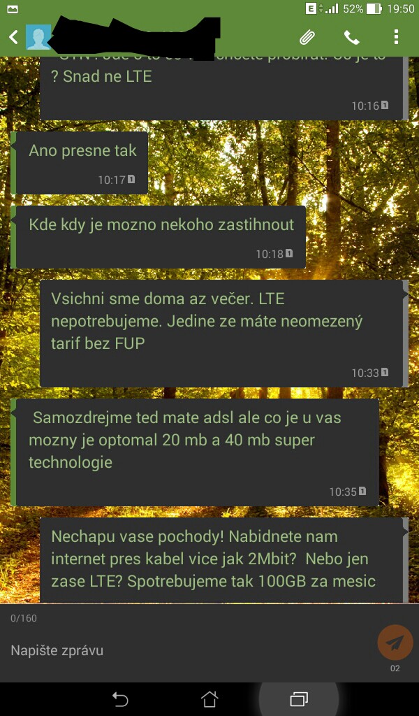 Já: "Takže to chápu správně. Mám vyměnit svůj pomalý, ale neomezený internet za možná rychlejší ale omezený a dražší." ... Odpověď se blížila přeskakující jehle gramofonu, kdy jsem se dozvěděl (dnes již po několikáté) že to je nová technologie a 100GB he naprosto nemožné.