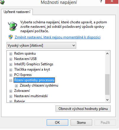Zdravím. Mám problém,že se mi v možnostech napájení-změnit nastavení schématu-změnit pokročilé nastavení napájení-řízení spotřeby procesoru neukazuje maximální a minimální spotřeba procesoru (v procentech). Zmizelo to z nabídky ze dne na den. Mám windows 8.1