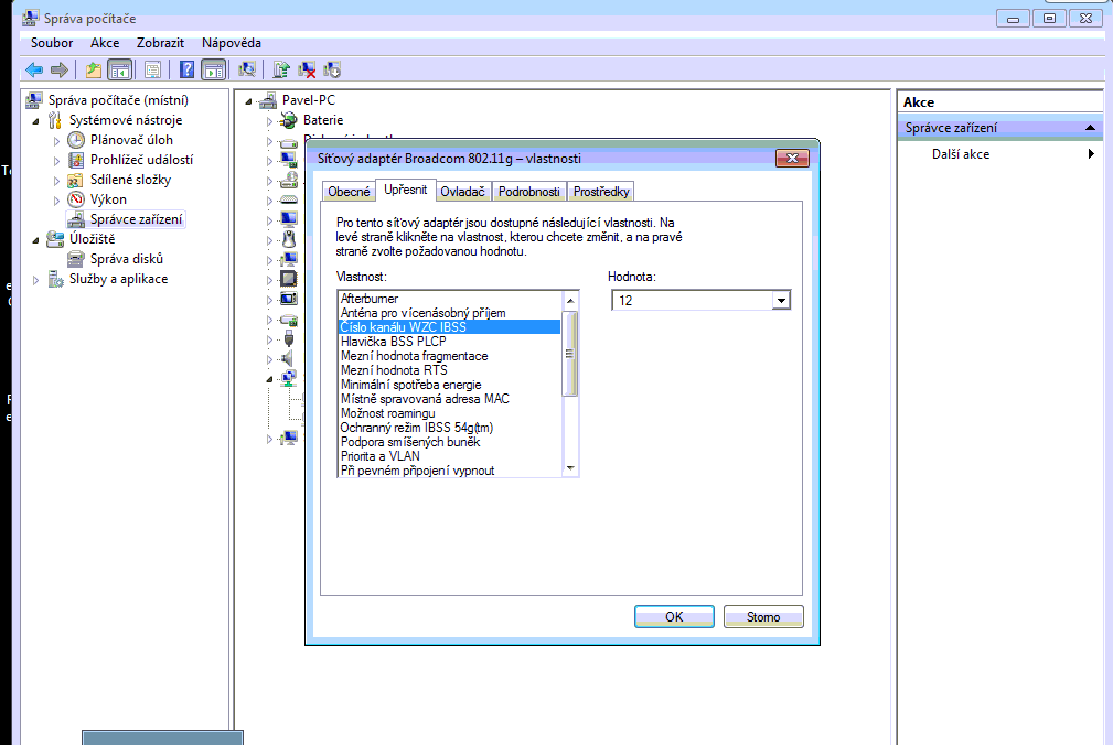 (na routeru máš česko, jinak by nemohl vysílat na 12.kanálu - viz "channel selection")