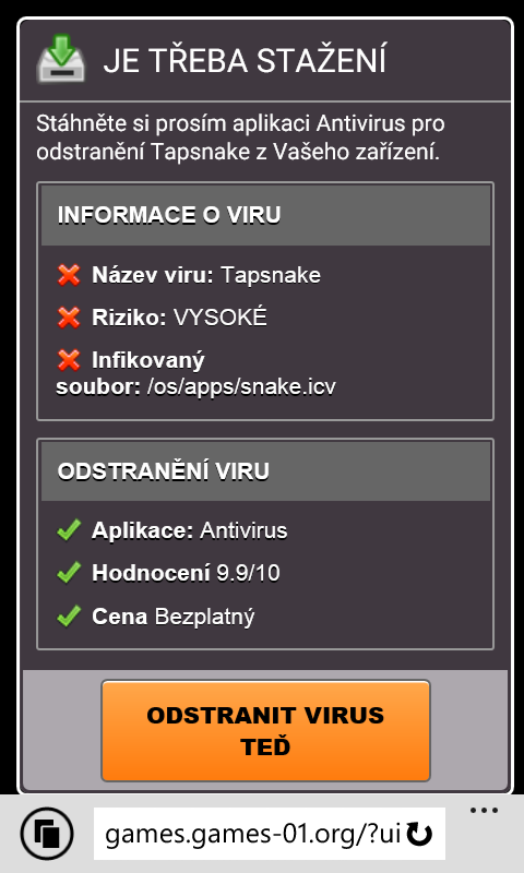 Ahoj, na svém mobilu jsem chtěl navštívit jednu stránku a vyskočilo mi tam něco o tom, že mám mobil nakažený virem tapsnake. Můžete mi poradit? Přikládám i foto.