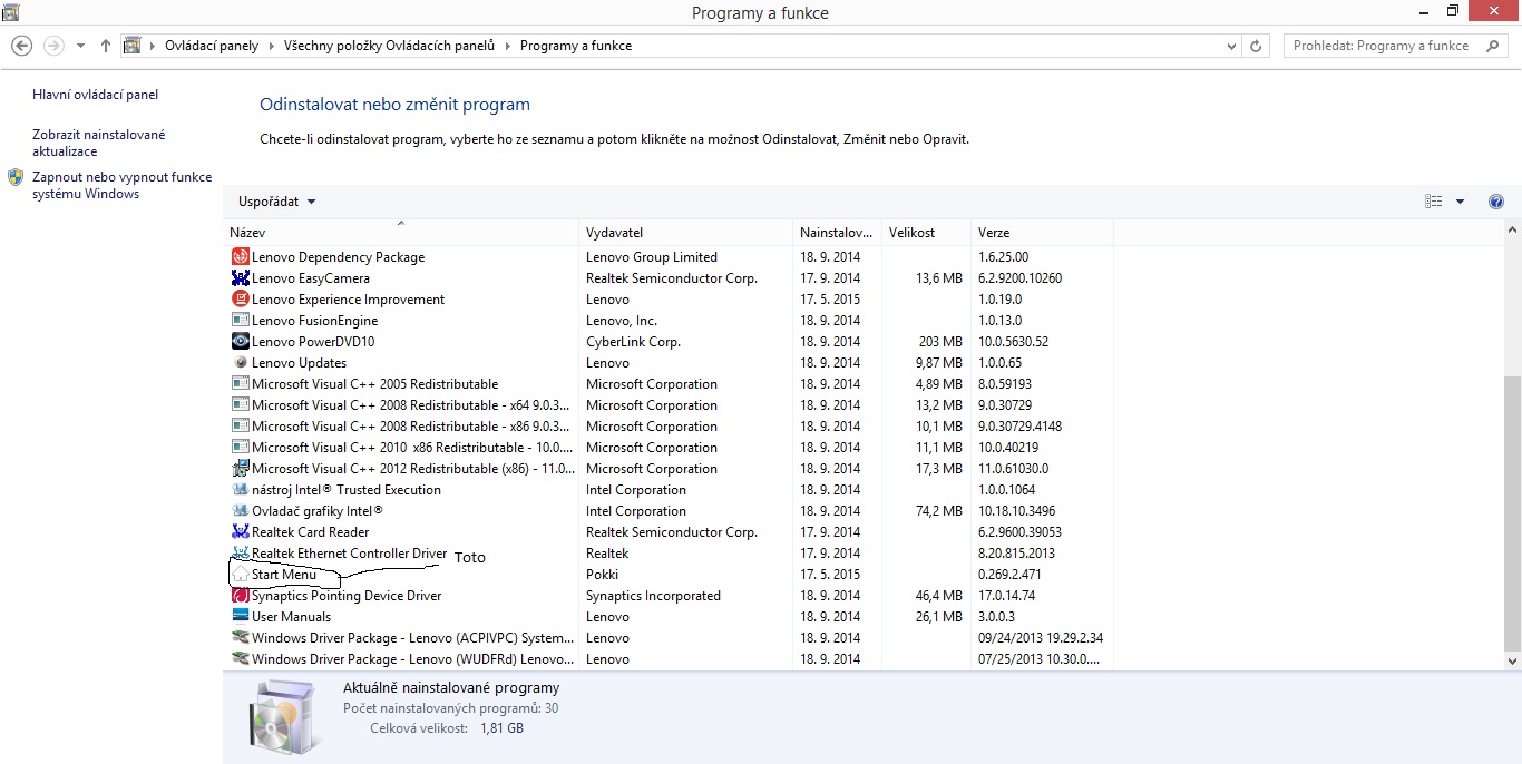 Dále se chci zeptat v nastavení ovládací panele programy a funkce je tam program Start menu.