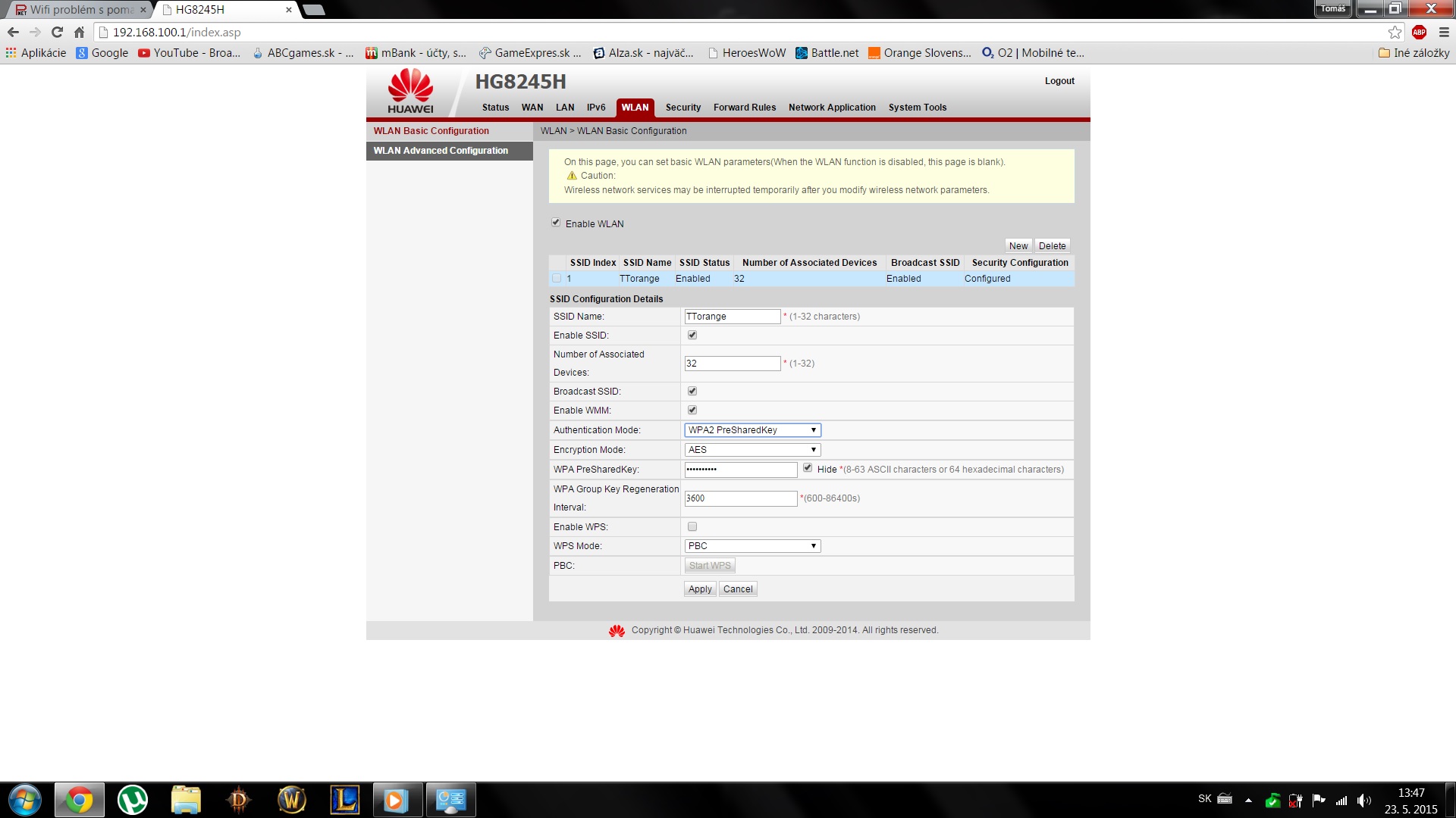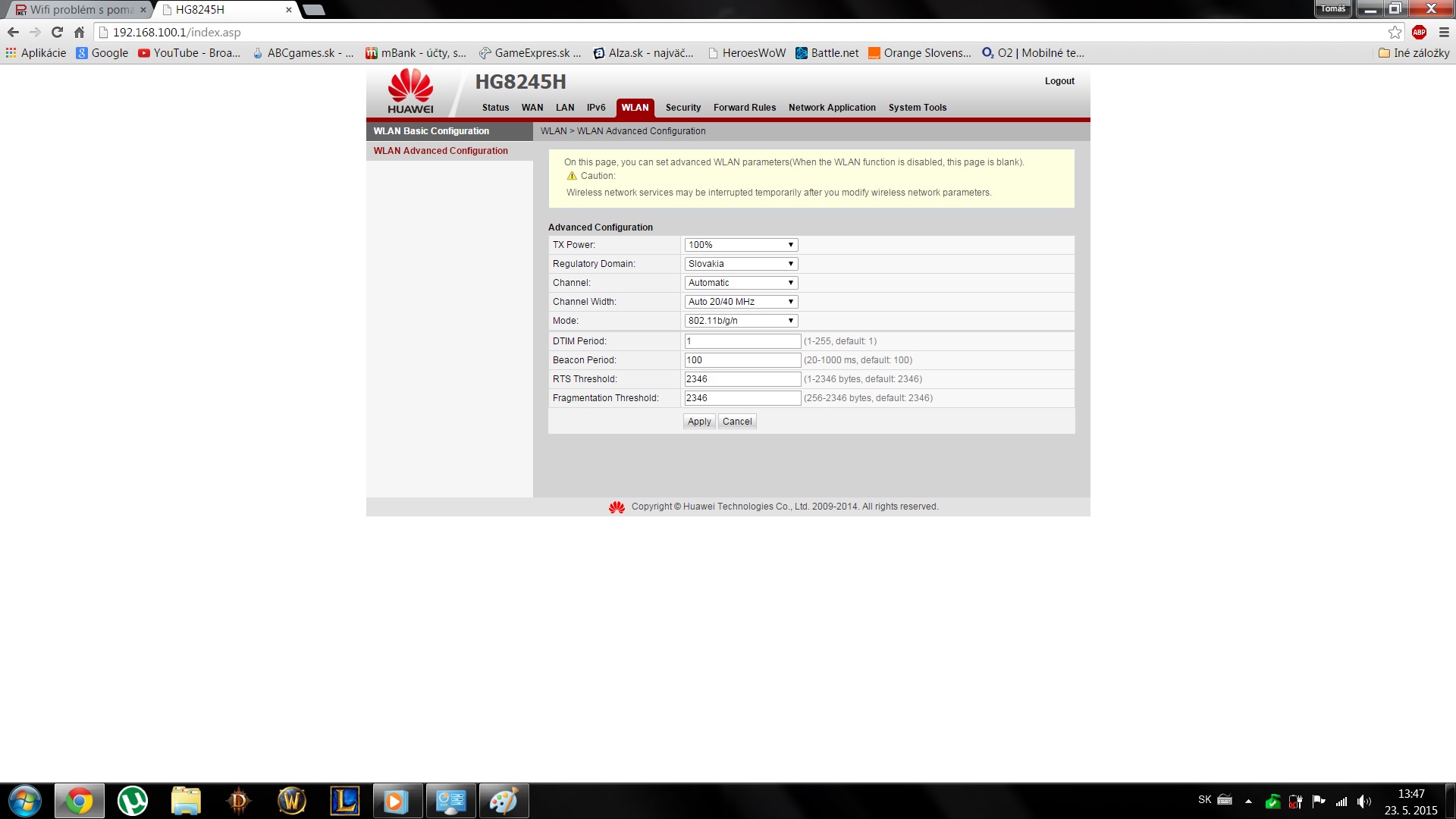 smerovač huawei HG8245H ktorý je zároveň aj wifi. a wifi v nb Intel(R) Centrino(R) Wireless-N 2230.