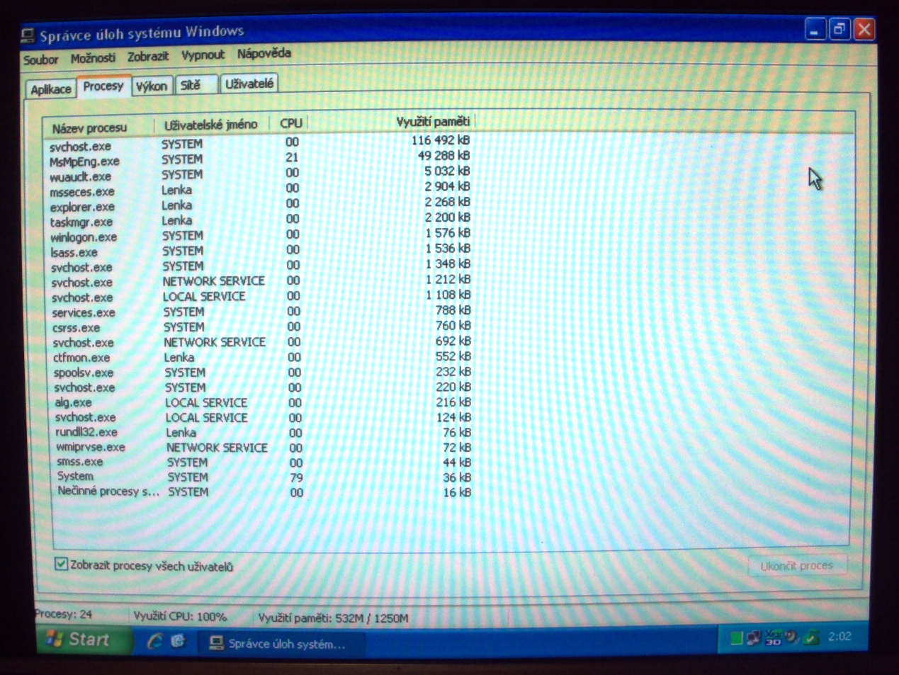 Dobrý den. Na dost staré PC (musel jsem vyměnit HDD) jsem naistaloval legální WinXP, před tím tam fungovalo normálně. Zaregistroval, stáhl všechny aktualizace a některé programy. Teď mě CPU jede neustále na 100% a neznám příčinu. Lze s přiložených fotek něco vyčíst? Děkuji za odpověď. :beer: Bohu žel nejdou mě sen vložit obrázky, píše mě to že jsem nezadal typ souboru. Nevím jak.