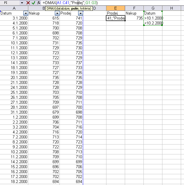 A ja potrebuji, aby ve sloupci G a H byl vzorecek, ktery se na zaklade datumu z E a F podiva do zdrojovych dat a v tomto datumovem rozpeti vyhleda nejvyssi hodnotu pro nakup a do druheho sloupce nejvyssi pro prodej.