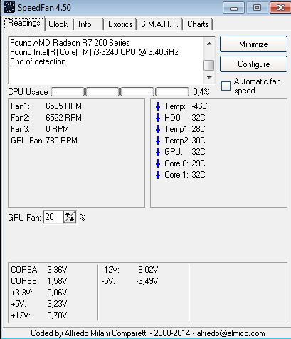 mám problém s grafickou kartou(název uveden v nadpisu), vždycky, když zapnu hru, tak zčerná obraz a hru musím vypnout přes správce úloh a někdy se zase musí vypnout celý počítač. Nevím jestli se grafika přehřívá. Na stupně se dívám přes program Speed Fan, ale nechce se mi tomu moc věřit. Když zapnu hru, tak stupně grafiky stoupnou až na 50 a když nehraju, tak se stupně grafiky pohybují kolem 30(viz. fotka). Potřebuji poradit, protože jsem ji dostal k narozeninám a v počítačích se moc nevyznám.