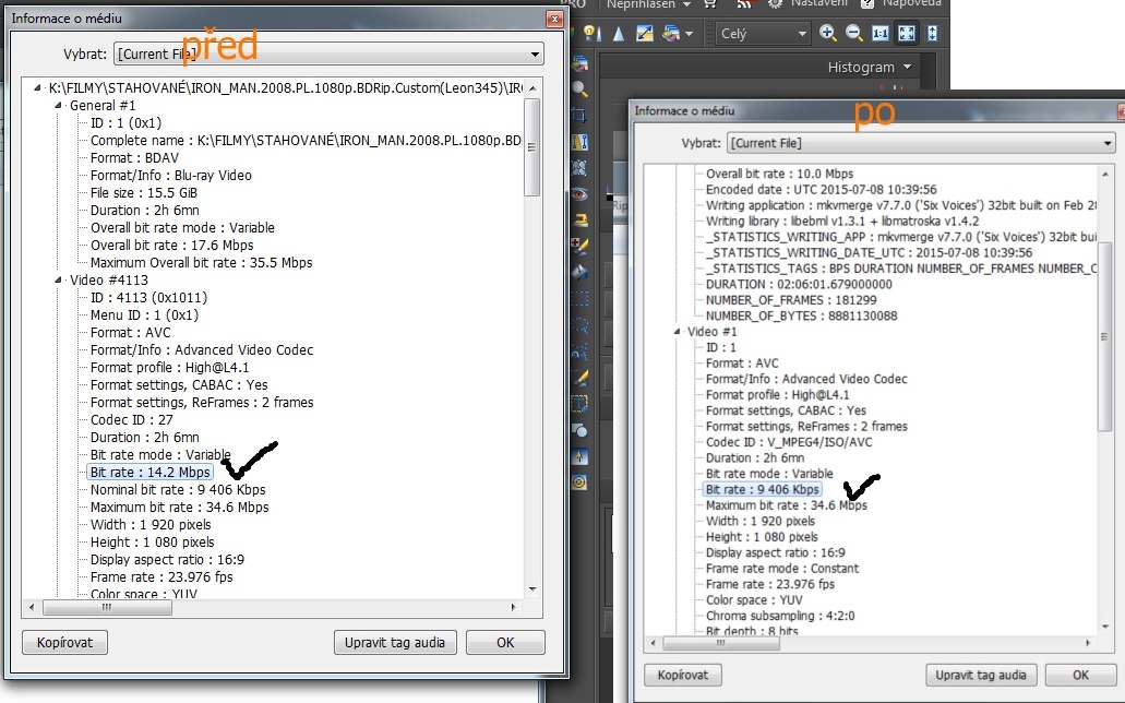 mam problém, stáhl jsem film ironmana, který má 20 gb a bitrate 18, po vyhození nežádoucích stop se ale video zmenší na nějakých 5 gb s bitrate 8 mbs. nežádoucí stopy vyhazuju přes mkvtoolnix mkv merge. u jiných filmů to jde normálně tak jak chci, video zůstane v původní velikosti a zmizí to co chci. takže jakto že se zhoršila kvalita a velikost videa?