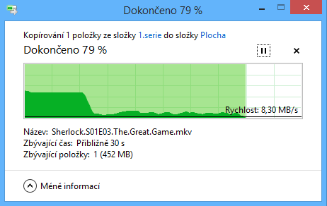 A když už ty rychlosti jedou jak mají, tak se soubory kopírují po nějaké chvíli zase pomalu. Kopíruji 2GB soubor z flashky (čtení 140 MB/s) na interní HDD (zápis 60 MB/s) a rychlost vyšplhá na 4 vteřiny na 140 MB/s a poté klesne na úrovni 10 MB/s.