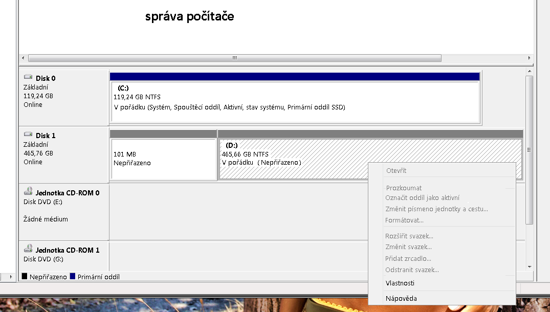 Ve správci počítače je druhý disk vidět jako nepřiřazený a nejde nijak nastavit, formát atp...