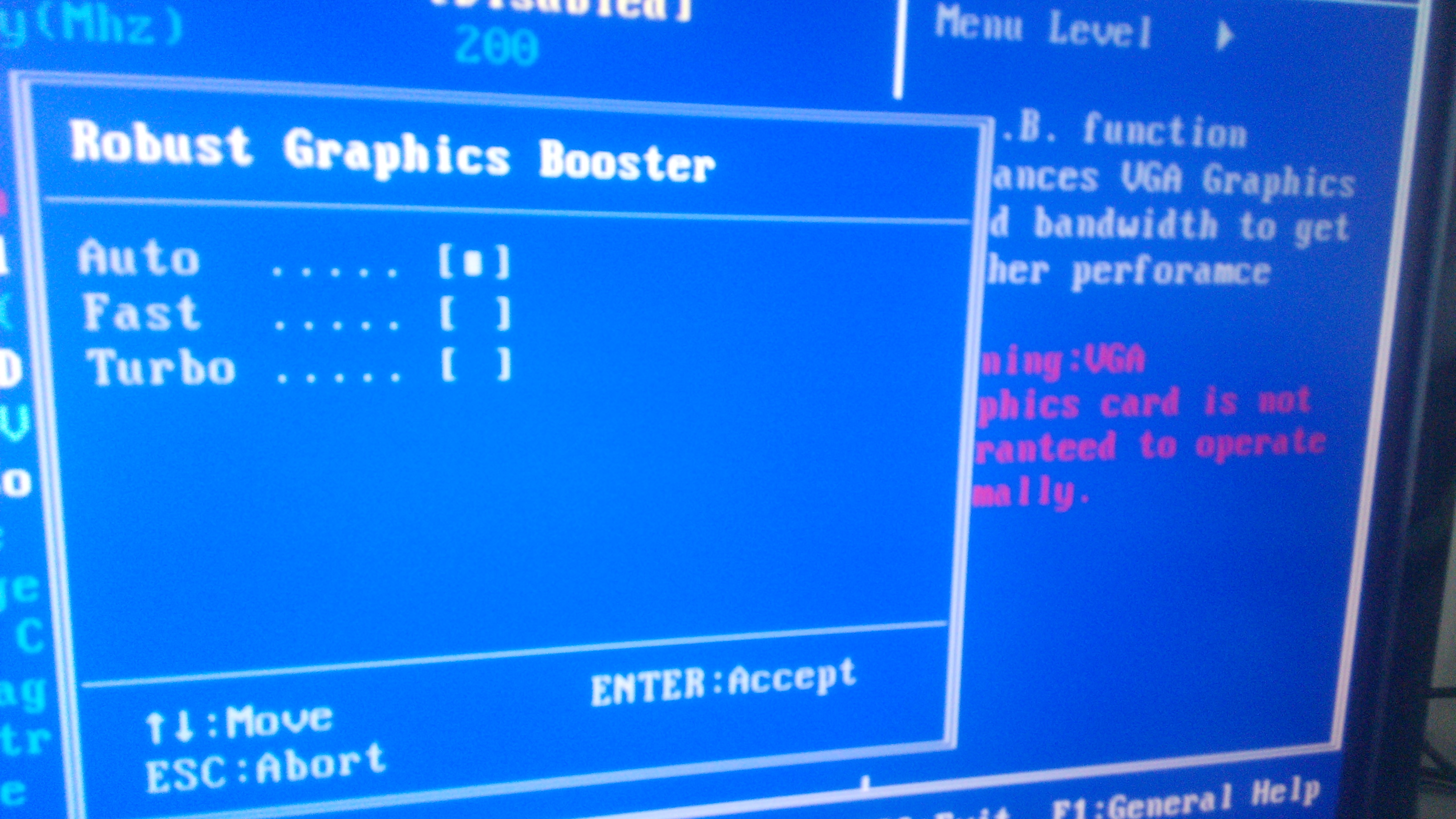 Když si najedu na položku Robust Graphics Booster tak mě to v právem menu píše: Warning: VGA Graphics card is not guaranteed to operate normally.
