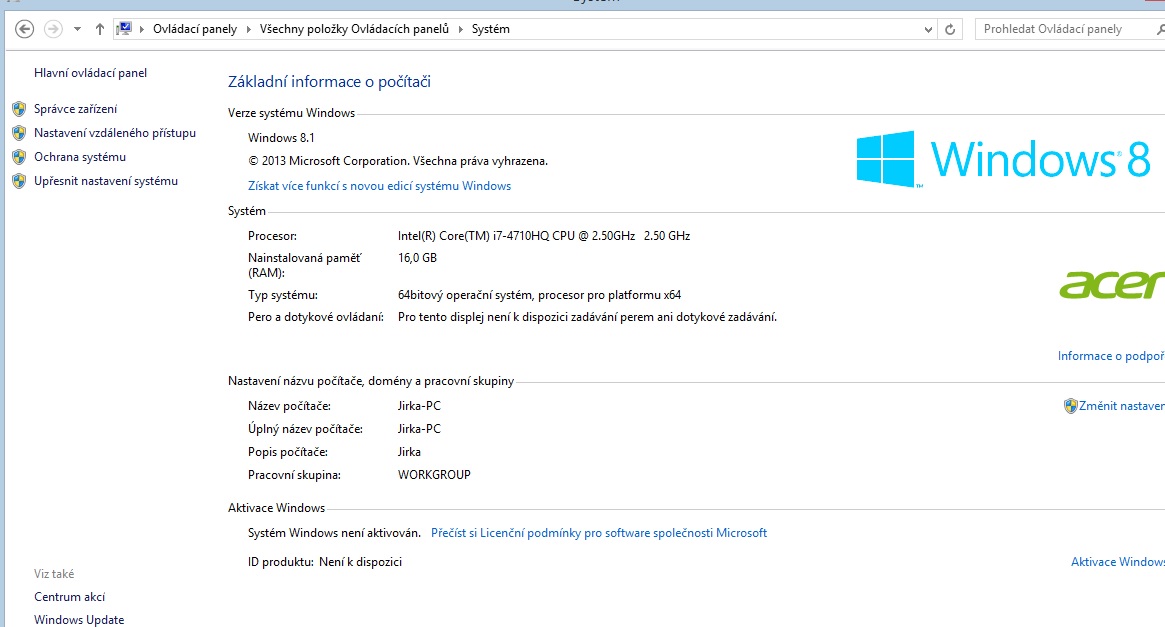- Pokud se přes ovládací panely kouknu na informace o PC tak dole je psáno, že Sytém windows není aktivován a že ID produktu není k dispozici.