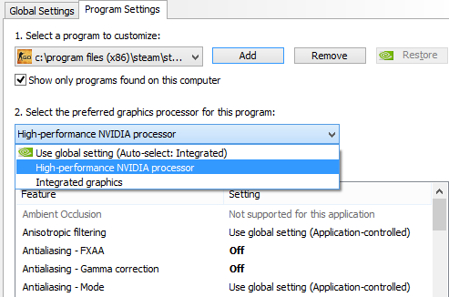 V control panelu nvidie mám nastavený ke hře CSGO - High-performance Nvidia Processor, nicméně všiml jsem si že u políčka: "Use global settings (Auto-selected: Integrated)", tam dříve slůvko "integrated" nebývalo, v závorce bylo také High-performance(viz. druhý obrázek).