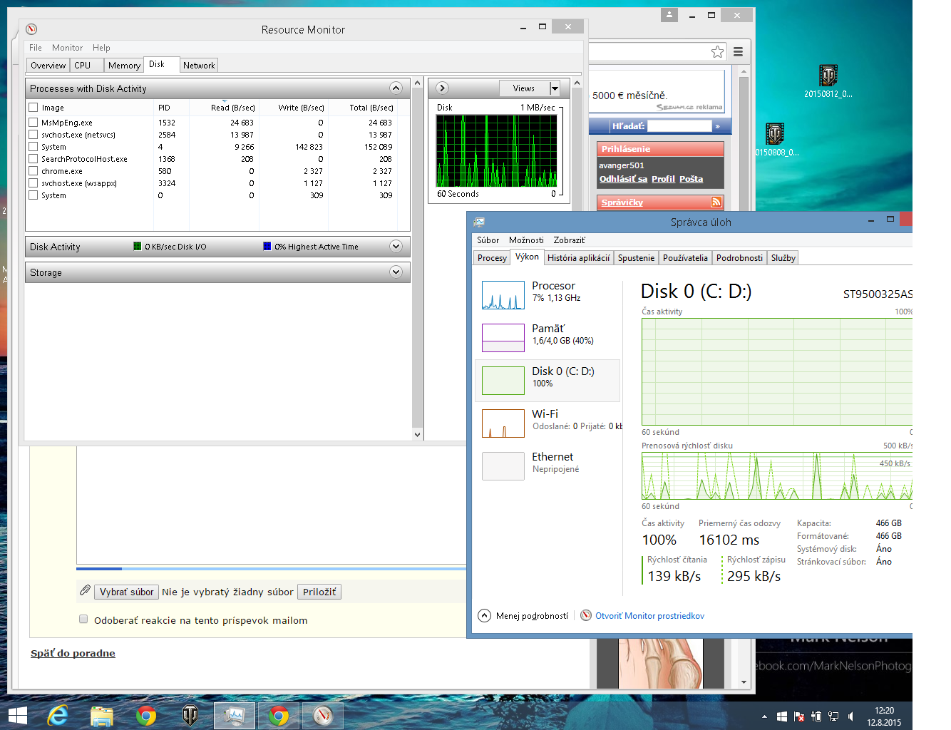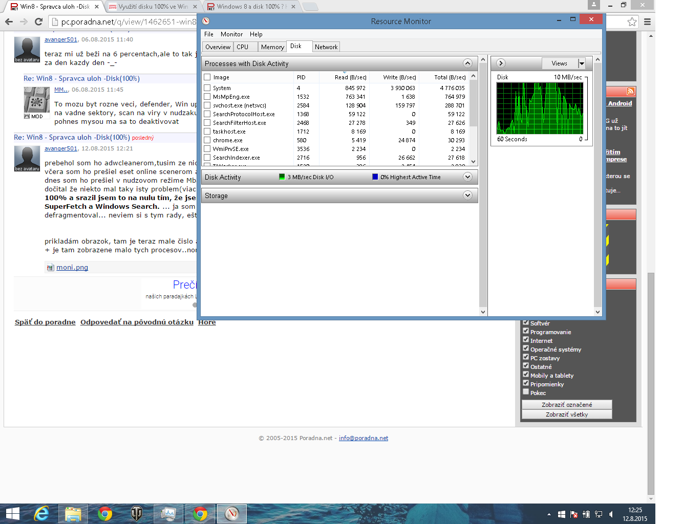 Zdravim..mam taky problem že ked zapnem ntb,tak zrazu mam Disk na 100% a ntb mi seka alebo laguje..neviem čo stym, v správcovy mi najčastejšie a najvyraznejšie svieti Systém... už som ntb aj defragmentoval,prešiel adwcleanerom a nepomohlo mi to...naposledy čo som do ntb daval bolo World of tanks(aj to som preinšrtaloval,lebo novy uptade mi nechcel nabehnuť...) viete mi nejako poradiť?