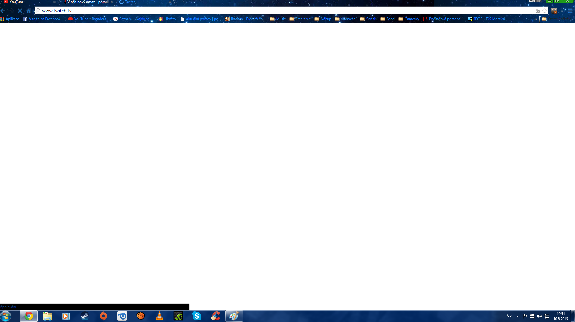 Zdravím mám takový problém když zapnu chrome a chci jít na twitch tak mi najede jen bílá obrazovka a buď to jen naběhne a nebo to furt načítá ale furt je jen bílá obrazovka nevím cco stím je vymazal jsem cookie zkuzil jsem i jiné prohlížeče restartoval pc a nic na tabletu na stejné wifi mi to jede nevíte co s tím ?