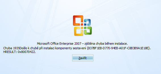 Kamarád chtěl přeinstalovat Office 2007 že mu nejdou. Začal jsem opravu a po cca 2/3 instalace systém vyhodil hlášku "chyba 1935Došlo k chybě při instalaci komponent sestavy " Zkusil jsem původní odinstalovat - nejde. Zkusil jsem vše v nouzovém režimu nejde.
