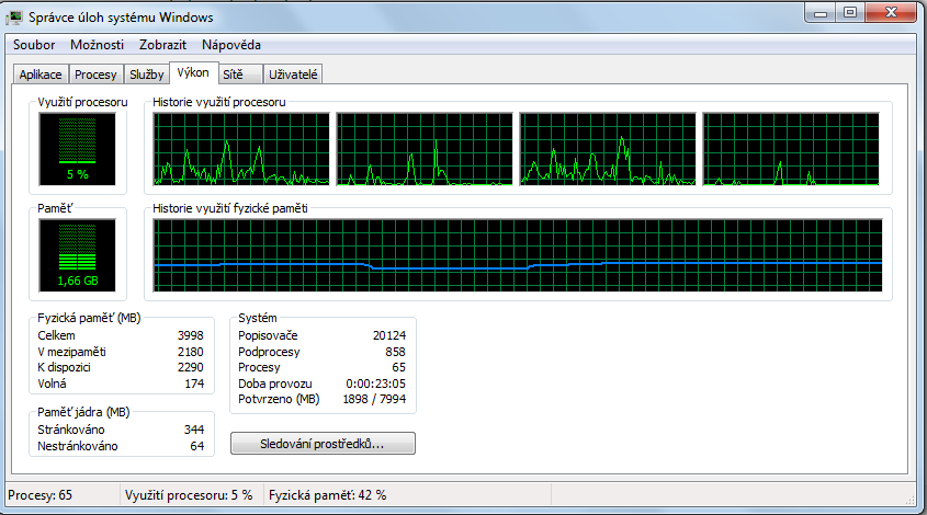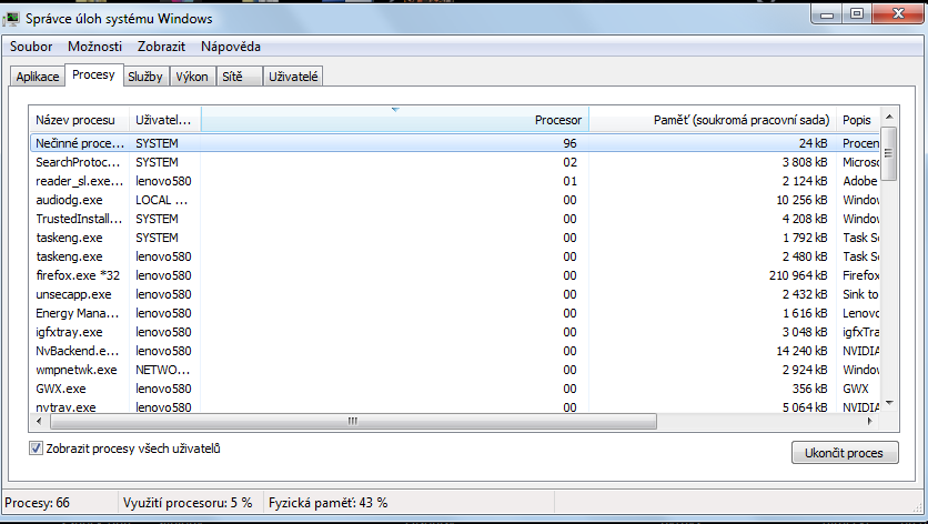 Dobrý den, zdá se mi že mám nevšední zatížení procesoru. V klidu to lítá tak 0-3 někdy 5 % a někdy to vyskočí prostě výš. RAM zhrube 1,3 GB dříve to bylo v klidu i 1,1 GB. Windows 7 ultimate. Přikládám printscreeny při zapnutém firefoxu a prohlížení netu. Dále by mě zajímalo, co je to co vytěžuje procesor nejvíce, to nečinné procesy má to 97 % žj. Také se mi zdá, že v poslední době nějak více hučí větrák, může to být prachem. Pracuji v praašném prostředí a nikdy za 2 roky jsem notebook nějak vevnitř od prachu nečistil. Díky