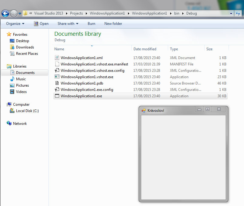 Documents > Visual Studio 201* > Projects > NázevProjektu > NázevProjektu > bin > Debug > NázevProje…