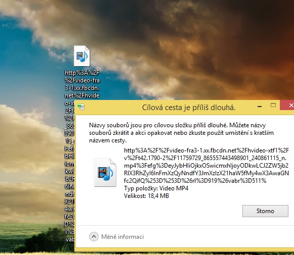 Tak si to přejmenuj hned při stahování,to http na začátku názvu je divné,nemáš uložený jen odkaz na ten soubor?Zkus dát pravým myšidlem něco jako Uložit cíl jako,Uložit soubor jako,Uložit odkaz jako... nebo co to nabídne.Mělo by vyskočit okno,kam a jak to uložit,tak to přejmenuj třeba na video1.mp4 apod.Klikni na ten stažený soubor,dej vlastnosti,jestli má opravdu těch 18,4MB.