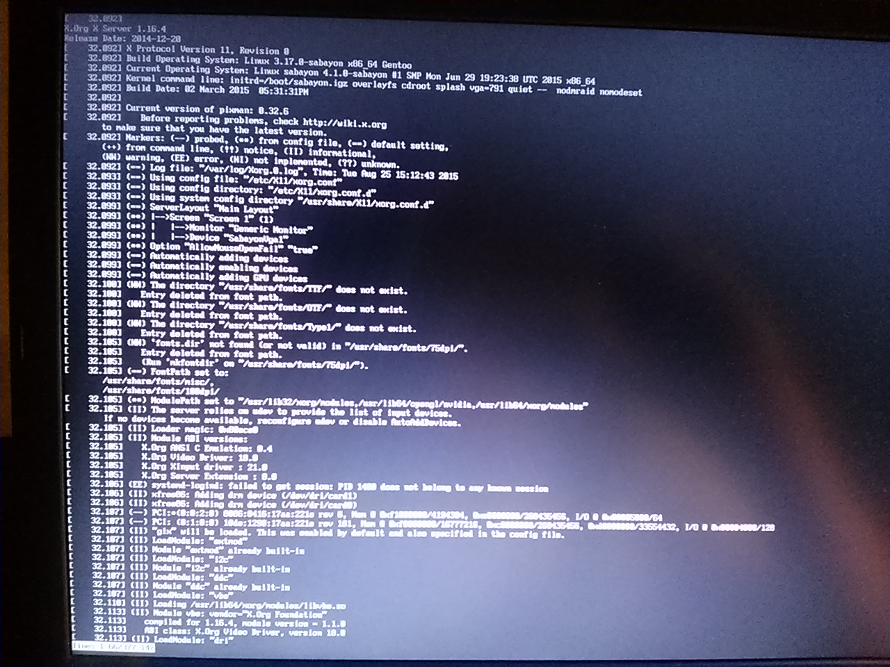 prikaze cat /var/log/Xorg.0.log | less jsem nahledl do souboru.Yda se z toho neco pouzitelneho vycist? 20150825-212250.jpg 493.54 KiB 20150825-212309.jpg 451.72 KiB 20150825-212319.jpg 491.31 KiB 20150825-212326.jpg 595.32 KiB 20150825-212331.jpg 585.65 KiB 20150825-212338.jpg 570.84 KiB