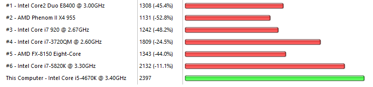 Prosím tě seš sběrač nic neříkajících čísílek. K čemu to je? K hovnu! Pasmark má potporu Win 2000,XP a to je moderní program? Prd starej nic neříkající blud na nic! Ano dal jsem test a jen 1950 bodu. To je vidět jaká to je zastaralá blbost.. že neumí vubec muj procesor. A ty co jsou jak takš moderní, tak v tom odkazu jsem jasně překonal i I5 4670K.