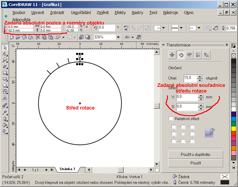 Nevím jak bych bez posunu středu rotace přesně nakreslil a vytisknul například takovýto štítek na měřící přístroj: