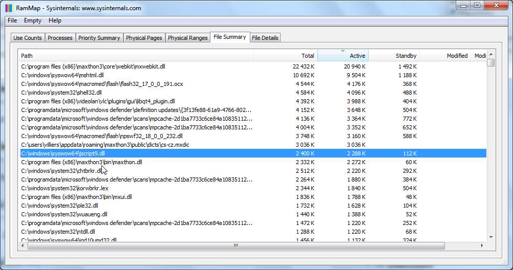 počkej si na zaplnění ram- soubor bude něčemu patřit a to bude viník. v menu je položka empty (vyprázdni- vyprázdni pracovní sady), je to násilná akce, ale uvolní ti ram. podle toho se dá dál dedukovat v čem je problém. seřadit se má podle sloupce active, nevím jestli nemluvím do dubu.