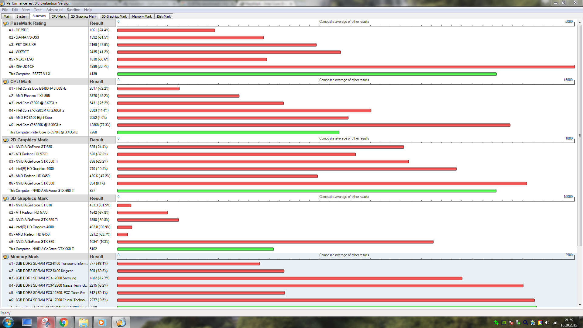 Ahoj, testuji svojí pc sestavu koupenou z druhé ruky: i5-3570K + ASUS GTX 660 Ti + 8 GB RAM. Jako první test jsem použil Passmark, výkon cpu odpovídá výkonům, co jsou v databázi. Ale ta GTX 660 Ti má podle testu spuštěného na mém pc výsledek 2100, ale výsledky z databáze jsou kolem 4700 http://www.videocardbenchmark.net/gpu.php?gpu=GeFo rce+GTX+660+Ti
