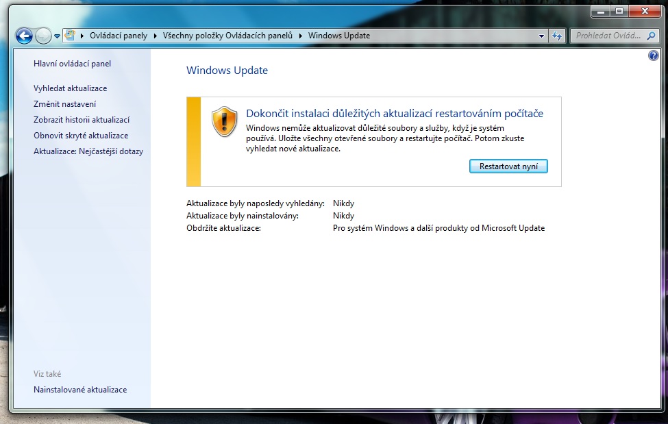 "Služba Windows Update nyní nemůže vyhledat aktualizace, protože tato služba není spuštěna. Zřejmě bude nutné restartovat počítač." Po restartu je to stejné a zjistil jsem, že i když to hlásí, že není služba spuštěna, tak ve službách spuštěna je a také všechny služby na kterých je závislá jsou spuštěny.