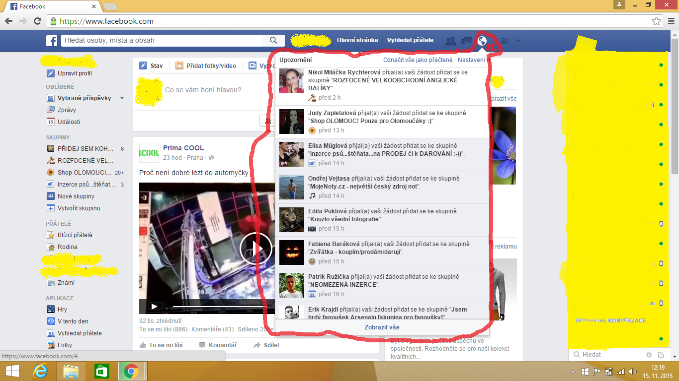 tak si dnes jdu tak po 2 dnech na FB (mimochodem, naposledy jsem tam byl ještě před teroristickými atentáty na Paříž) a najednou se mi zjeví velmi zajímavá věc. To že jsou všude zprávy o atentátech v Paříži a že si skoro každý dává na profil francouzskou vlajku, to ještě pochopím, ale že mi přijde 22 upozornění(taková ta ikonka planety u zpráv a žádosti zpráv), že mě přijalo různých 22 lidí do jakýchsi veřejných skupin. Kdybych o to žádal, tak to pochopím, ALE JÁ JSEM O VSTUPU DO TĚCHTO SKUPIN VŮBEC NEŽÁDAL A PŘITOM JSEM SE TAM DOSTAL! A TO MĚ VELMI NASRALO. Velmi zajímavé také je, že všechno se odehrálo V JEDEN DEN. Nechápu to, fakt ne. FB nemám tak dlouho a jestli mi někdo přišel na heslo?! Nevím, přijde mi to divné. Vím, že se fb celkem jednoduše hacknout. Proto bych se vás rád zeptal, jestli se vám toto taky někdy stalo, a jestli je to normální, nebo bych měl na svém fb zvýšit pozornost. Všem děkuji za radu. Přidávám screenshot, jak to asi vypadalo. Některé věci jsou dokreslené, už to nemůžu vrátit zpět. Mimochodem, mou fotku, jméno a jména mých přátelů jsem vymazal, aby to někdo nemohl zneužít.