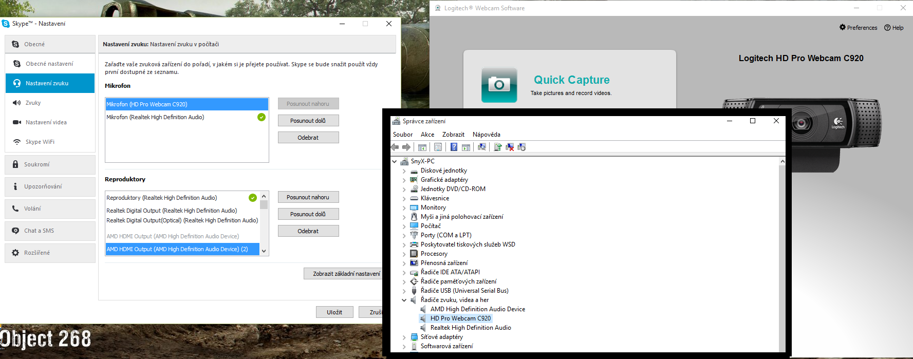 Video mi jde normálně, ale jelikož mi odešel stolní mikrofon, chci zapojit mikrofon z kamerky. Jenže nejde, Skype ho nevidí. Ve správci zařízení je vidět kamera OK, viz screen, skype ho taky vidí, ale jen v rozšířeném režimu, ale je šedý a nejde odfajfknout stejně jako původní mikrofon, viz screen.