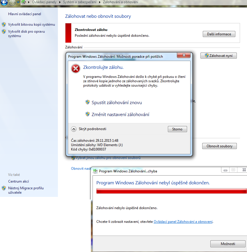Nemyslim, ze by mohla byt i po te chybe zaloha pres bitovou kopii funkcni, vic snad poradi nejaky znalec, tohle neznam, nicmene muzes zkusit protokol udalosti v nastrojich pro spravu, kde by treba mohlo byt vic a pripadne to hodit do Google, jestli to treba uz nekdo jiny neresil tez.