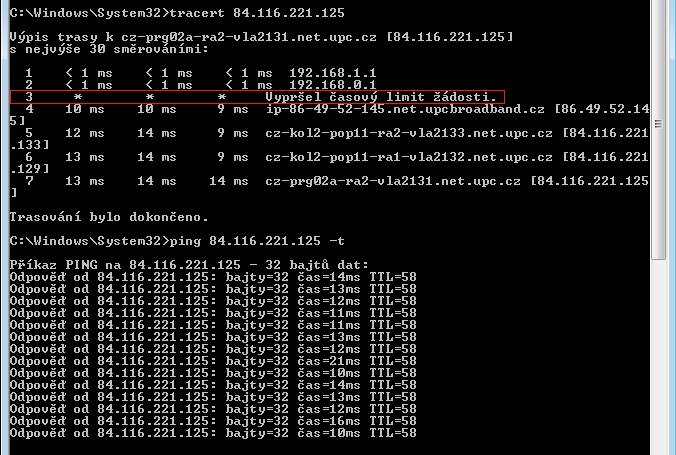 V 3. bodě tracert vždy dojde k vypršení žádosti, což je vlastně hned za modemem od UPC.